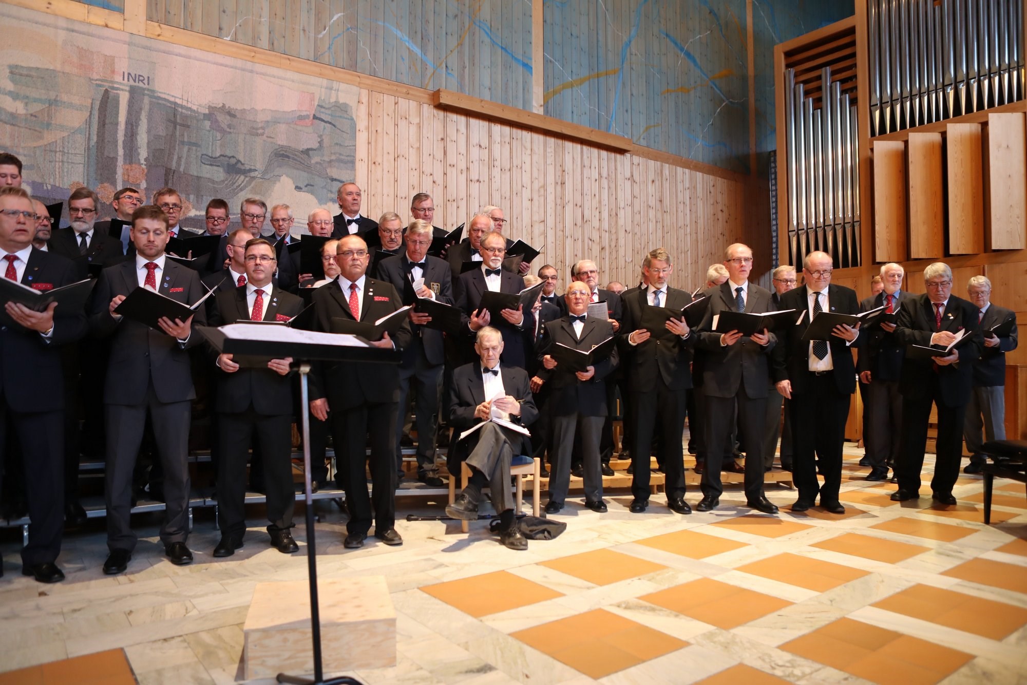 Hela kören samt delar av publiken i en fullsatt kyrka